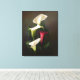 Lírios de Calla, brancos e vermelhos, pintados digitalmente em um jardim escuro.