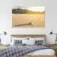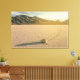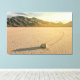 A imagem mostra uma paisagem de Racetrack Playa, um lago seco no Vale da Morte, Califórnia. Uma rocha grande fica na superfície rachada e seca, lançando uma longa sombra. Atrás da rocha, uma trilha sinuosa marca seu caminho através da peça. Ao fundo, montanhas se erguem contra um céu com nuvens espalhadas. A cena é banhada numa luz quente e ouro, criando uma atmosfera serena e misteriosa.