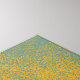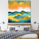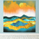 Cena de paisagem abstrato de uma zona de montanha com colinas rolantes e uma tempestade de chuva em laranja, ouro, azul e ciano.