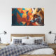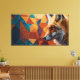 Uma raposa se mantém confiante, exibindo seu vibrante pelo laranja. O fundo apresenta um padrão geométrico colorido, criando uma atmosfera interior viva.