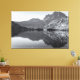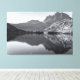 Uma fotografia monocromática captura uma cena serena do Lago Silver. A água tranquila reflete perfeitamente as montanhas e árvores circundantes, criando um efeito espelhado. As montanhas sobem majestamente ao fundo, suas superfícies rochosas detalhadas em tons de cinza. Uma linha de árvores pontua a margem costeira, adicionando profundidade à composição.