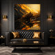 Imaginem uma peça cativante de arte contemporânea: um urso graciosamente imerso nas águas tranquilas, com sua reflexão a brilhar por baixo, tudo colocado num pano de fundo de matizes negros e dourados contrastantes.