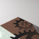 Relógio antigo e patenteado, adornado com joias, mãos de ouro e algarismos latinos com rosa de turquesa sobre fundo castanho e listrado. Estilo Steampunk.