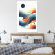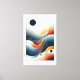 A imagem apresenta um design abstrato com padrões fluidos, semelhantes a ondas, que criam uma sensação de movimento. Esses padrões são compostos por numerosas linhas finas em um gradiente de cores que vão do azul, laranja ao branco, sugerindo profundidade e dimensionalidade. A composição é ancorada por três círculos de cor sólida: um grande círculo preto no canto superior esquerdo, um círculo vermelho médio em direção ao centro inferior e um pequeno círculo preto próximo ao canto inferior direito. O fundo é branco claro, que contrasta com as cores vibrantes das ondas e círculos, aumentando o seu impacto visual.
