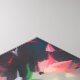 Retrato da Rosa de Baccara, com pétalas perfuradas para fora como uma exibição vibrante de fogos de artifício, espalhando fragmentos de cor para o ar