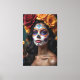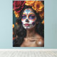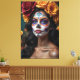 Um retrato cativante de uma bela mulher com a intrincada maquiagem Día de los Muertos, seu cabelo fluido adornado com rosas vibrantes. Esta canvas comemora a elegância e a profundidade cultural do Dia dos Mortos, misturando beleza, simbolismo e tradição em uma impressionante obra de arte.