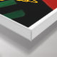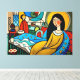 Distinctive abstract forms and vivid colors create a vibrant scene featuring a woman in a yellow dress, seated on a star-covered bed. A standing figure in red and swirling patterns add depth and motion to the background.
