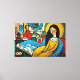 Distinctive abstract forms and vivid colors create a vibrant scene featuring a woman in a yellow dress, seated on a star-covered bed. A standing figure in red and swirling patterns add depth and motion to the background.