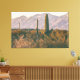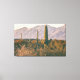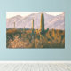 A imagem mostra uma paisagem desértica com vários cactos de saguaro em primeiro plano. Os cactos são altos e verdes, destacando-se contra a vegetação seca e marrom-ouro. Ao fundo, uma faixa de montanhas é visível, seus picos levemente poeirados com neve.