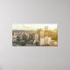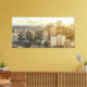Uma vista aérea da paisagem urbana de São Francisco, mostrando uma densa coleção de prédios banhados em luz quente e ouro do sol. A imagem captura uma mistura de estilos arquitetônicos, desde arranha-céus modernos a estruturas históricas, com uma igreja proeminente no centro. O céu é azul macio com nuvens brancas e peludas, acrescentando um senso de tranquilidade à surpreendente cena urbana.