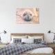 Uma fotografia de proximidade captura uma grande foca elefante que repousa numa praia arenosa. Os olhos da foca estão fechados, e a sua grossa pele de cinza é visível. O focinho da foca é proeminente, com um nariz pequeno e molhado. O fundo é um borrão suave, arenoso, criando uma atmosfera pacífica e serena.
