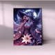 Sob o olhar silencioso de uma lua colossal, um anjo etéreo, enfeitado com penas como corujas, graciosamente emerge das sombras. Seu cabelo longo e branco se cascata em volta de uma face serena, e os olhos vermelhos piercing olham com sabedoria antiga. Com asas vastas e penas descobertas e lírios brancos brilhando suavemente ao seu redor, ela encarna uma presença delicada mas poderosa, uma guardiã da noite da lua
