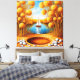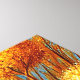 Trabalho de arte vívido com um pôr do sol tranquilo, um veleiro refletindo em águas calmas, árvores ouros e arredores cênicos imbuídos de cores quentes e composição harmoniosa evocando paz e relaxamento.