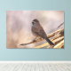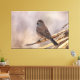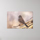 Um pequeno pardal de garganta negra é empoleirado num galho fino e seco. O pássaro tem uma cabeça escura com uma faixa branca acima do olho e uma mancha escura debaixo do bico. Suas asas são marrons com faixas mais escuras, e sua cauda é preta. O fundo está turvo com cores macio e úmidas de castanho e bege. O pássaro está virado para a esquerda, olhando para longe do espectador. O humor geral é pacífico e natural.