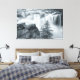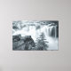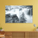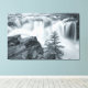 Uma fotografia monocromática captura as cataratas de Sunwapta no Parque Nacional de Jasper, Canadá, em cascata sobre rochas, com um pequeno pinheiro no primeiro plano. A água parece lisa e turva devido a uma longa exposição, criando uma sensação de movimento. As rochas irregulares são visíveis no lado esquerdo da armação, fornecendo um contraste com a água corrente. O pinheiro fica à direita, adicionando um toque da resiliência da natureza à cena.