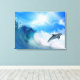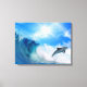 Uma pintura de um golfinho que parece estar surfando nas ondas do oceano.