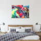 Uma composição vibrante apresenta uma intrincada mistura de formas giratórias e cores vívidas, formando uma paisagem abstrato. Elementos orgânicos como árvores e folhas são entrelaçados com padrões geométricos, criando uma cena dinâmica e harmoniosa.