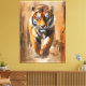 Uma representação eletrificante de um médio-stride-tigre, pintada com pinceladas ousadas e expressivas que misturam realismo e emoção crua. O olhar do tigre é bloqueado para a frente — intenso, inabalável, e vivo com energia primária. Os tons cor de laranja e preto vibrantes deslizam num pano de fundo de matizes de terra, criando um contraste dinâmico que amplifica o movimento e o domínio do predador. O fundo de abstrato funde-se na forma da besta, desfocando a linha entre a natureza e a canvas. Isto não é apenas um tigre — é o ímpeto, foco e energia capturados na tinta.