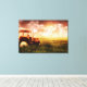 Com respiração, tendo em conta um trator que arava os campos de trigo com um sol laranja por detrás do trator.
