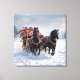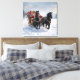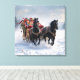 Dois cavalos negros estão puxando um trenó cheio de presentes coloridos de Natal através de uma paisagem nevada