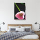 Fotografia viva de uma tulipa rosa cortada fresca, com caules verdes longos, colocada sobre o tecido preto. Copyright ©Kimberly J Tilley.