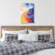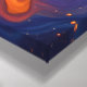 This is a dramatically vivid and deeply saturated abstract fluid artwork. The composition is split into two opposing, yet merging, energy fields. The left side is dominated by intense, bright orange and fiery gold tones, suggesting warmth, sun, or a celestial explosion. This energy dramatically collides with the right side, which features deep indigo, rich sapphire blue, and mysterious violet/purple hues.