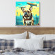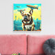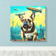 Um Bulldog Francês fica em destaque no telhado com um pano de fundo de uma fantástica paisagem urbana com marcos globais icônicos. Vários dirigíveis flutuam no céu, somando-se à atmosfera química.