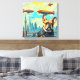 Um Bulldog Francês fica em destaque no telhado com um pano de fundo de uma fantástica paisagem urbana com marcos globais icônicos. Vários dirigíveis flutuam no céu, somando-se à atmosfera química.
