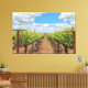 Um vinhedo pitoresco se estende sob um céu azul brilhante, pontilhado com nuvens brancas lisas. Linhas de videiras verdes, escorridas, apoiadas por postadas resistentes de madeira, conduzem o olho para uma colina distante. O chão está coberto por uma camada de folhas secas e marrons, acrescentando um toque de encanto rústico à cena. A imagem evoca um sentido de tranquilidade e a beleza da recompensa da natureza.