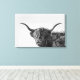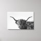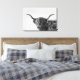 Tela impressa de uma vaca escocesa Higland, resistente mas engraçada, com chifres grandes, pêlos longos em frente aos olhos e a boca meio aberta em preto e branco / monocromático. decoração de excelente na sua parede!