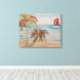 Nave-vela com velas vermelhas, navegando em água oceânica cortada ao lado de uma praia com palmeiras brancas em primeiro plano, uma obra de arte mestiça.