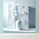 A minimalist still life with sculptural clarity: white orchids bloom from a matte vase, set against a backdrop of vertically layered panels. Soft, precise lighting casts gentle shadows, enhancing spatial depth. The scene remains monochrome and calm—an image that blends floral presence with architectural structure. Perfect for interiors that value reduction and atmosphere.