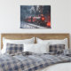 Locomotiva a vapor antiquada numa tempestade de neve com luzes vermelhas brilhantes.