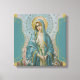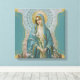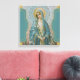 Linda tela impressa da Virgem Abençoada Maria segurando lírios em suas mãos. A impressão está cercada de flores e ouro decorativo e borda azul aqua.