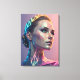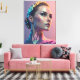 A futuristic portrait of a woman reimagined through geometric abstraction and neon tones. This elegant and powerful wall art adds a bold modern aesthetic to any interior.