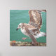 Uma gaivota com penas marrons e brancas se posiciona sobre um píer com penas, suas asas se espalham como se se preparasse para pegar voo. A cabeça do pássaro é virada para o lado, seu bico amarelo ligeiramente aberto. O fundo apresenta um oceano calmo, cor de lacre, criando uma atmosfera serena e pacífica.