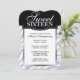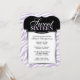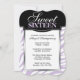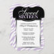 Corte no estilo de braquete, Na moda e impressão zebra única Doce 16 convites de aniversário com um design de cabeçalho de quadro preto sobre um padrão de stripes de zebra roxa e branca e impresso com detalhes de celebração.