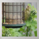 Um Greenfinch ganancioso desfrutando de uma semente em um alimentador de aves. Esta impressão faria um presente excelente para amantes de pássaros.
