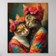 Uma ilustração artística e animadora de dois gatos afetivos compartilhando um abraço macio. Estes adoráveis companheiros felinos estão vestidos com roupas florais vibrantes adoradas com flores laranja, rosa e lacrimogêneas brilhantes. Cada gato veste uma charmosa peça floral com grandes flores que combinam com as cores vívidas de suas roupas, acrescentando um toque brilhante e alegre à cena. As expressões dos gatos são serenas e alegres, olhos fechados enquanto se amontoam. Colocada contra um fundo macio e paixão com matizes quentes, esta trabalho de arte exumenta um sentimento aconchegante, artístico e romântico. Perfeito para amantes de gatos, entusiastas de arte, ou qualquer pessoa que esteja procurando um design único e encantador para receber cartas, arte de parede ou itens de presentes. Ideal para temas como amor, amizade, casamentos ou decoração doméstica aconchegante
