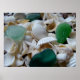 Conchas brancas frescas em torno de uma variedade de vidro marinho verde.