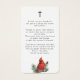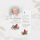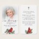 This elegant memorial prayer card features a cherished photo paired with the heartfelt words In Loving Memory and a symbolic red cardinal resting on evergreen branches. Often seen as a sign of comfort and continued presence, the cardinal adds gentle meaning to this timeless design. The reverse side includes a comforting prayer accented with a simple cross offering peace and reflection, making this card a thoughtful keepsake for a funeral, memorial service or Celebration of Life shared with family and friends. Its small and portable size of 3.5x2" (wallet-sized) makes it convenient for loved ones to carry it with them as a reminder of your loved one’s life and spirit. Personalization makes each card unique.