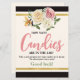 Este sinal de mesa de jogos de azar ou de noz-branca corresponde à coleção de chás de panela mostrada abaixo e apresenta uma paleta de cor preta e marfim com faixas finas de ouro simuladas, na parte superior e inferior, com um buquê bonito de rosas cor-de-rosa, marfim e amarelo pálido com uma lírio peruana laranja e uma folhagem verde no topo. As palavras "Quantas doces estão no vidro?" são impressas em rosa-coral e preto com instruções para o jogo e uma mensagem de "Boa sorte!" em preto e verde abaixo. Junte-o ao cartão de visita e coloque-o ao lado de um grande frasco cheio de sua escolha de doces para um jogo divertido no seu evento de casamento. Se precisar de mais alguma coisa para corresponder a esta coleção, envie um e-mail para niteowlstudio@gmail.com ou use o bate-papo Zazzle para entrar em contato.
