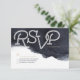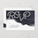 Design de RSVP típico de música moderna no fundo azul-indigo azul-água, excelente para casamento moderno, casamento noturno ou casamento náutico. Veja todas as peças correspondentes na coleção abaixo.