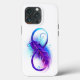 Símbolo infinito com uma bela pena pintada em cores roxas e azuis brilhantes sobre fundo branco.