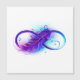 Símbolo infinito com uma bela pena pintada em cores roxas e azuis brilhantes sobre fundo branco.