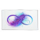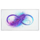 Símbolo infinito com uma bela pena pintada em cores roxas e azuis brilhantes sobre fundo branco.