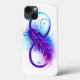 Símbolo do infinito com uma bela pena pintada em cores vibrantes roxas e azuis sobre um fundo branco.