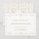 Vintage elegance ornamentado de espiral do quadro do design em cor dourada sobre fundo branco editável. Cor damasco com design monograma nas costas, moderna, elegante e elegante, perfeita para o casamento vintage, casamento de arte deco durante todo o ano. Cor de fundo editável para corresponder às cores do tema do casamento. Personalize-o com qualquer informação que você gostaria que seu convidado soubesse. Veja todas as peças correspondentes nesta coleção do "Dourado casamento Clássico Moderno" abaixo.