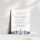 Projetado para coordenar com a nossa coleção de convites para casamento Marraquexe inspirada em Marrocos, este cartão simples e chic contém marinho de letras azuis acentuadas com um intrincado marinho e uma fronteira geométrica branca ao longo da base. Substitua o texto da amostra pelos detalhes chave da sua celebração do casamento. Que informações incluir em um convite de casamento? Considere detalhes como acomodações de hotel, códigos de grupo, transporte, instruções, informações de recepção de boas-vindas e sua URL do site de casamento. Você pode até fazer upload de um mapa para o lado inverso usando a função personalizar. Precisa de ajuda com o texto ou a formatação? Eu adoraria ajudar! Entre em contato com Kristen através do link "pergunte a este designer".