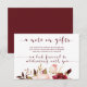 Dreamy encontra-se rústico com este cartão de presentes de casamento em Burgundy Flóral. Adicione o seu próprio texto ao modelo na frente e/ou atrás. Para personalizar, basta adicionar seu texto ao modelo ou selecionar 'personalizar mais' para mover o texto. Cartões correspondentes disponíveis.